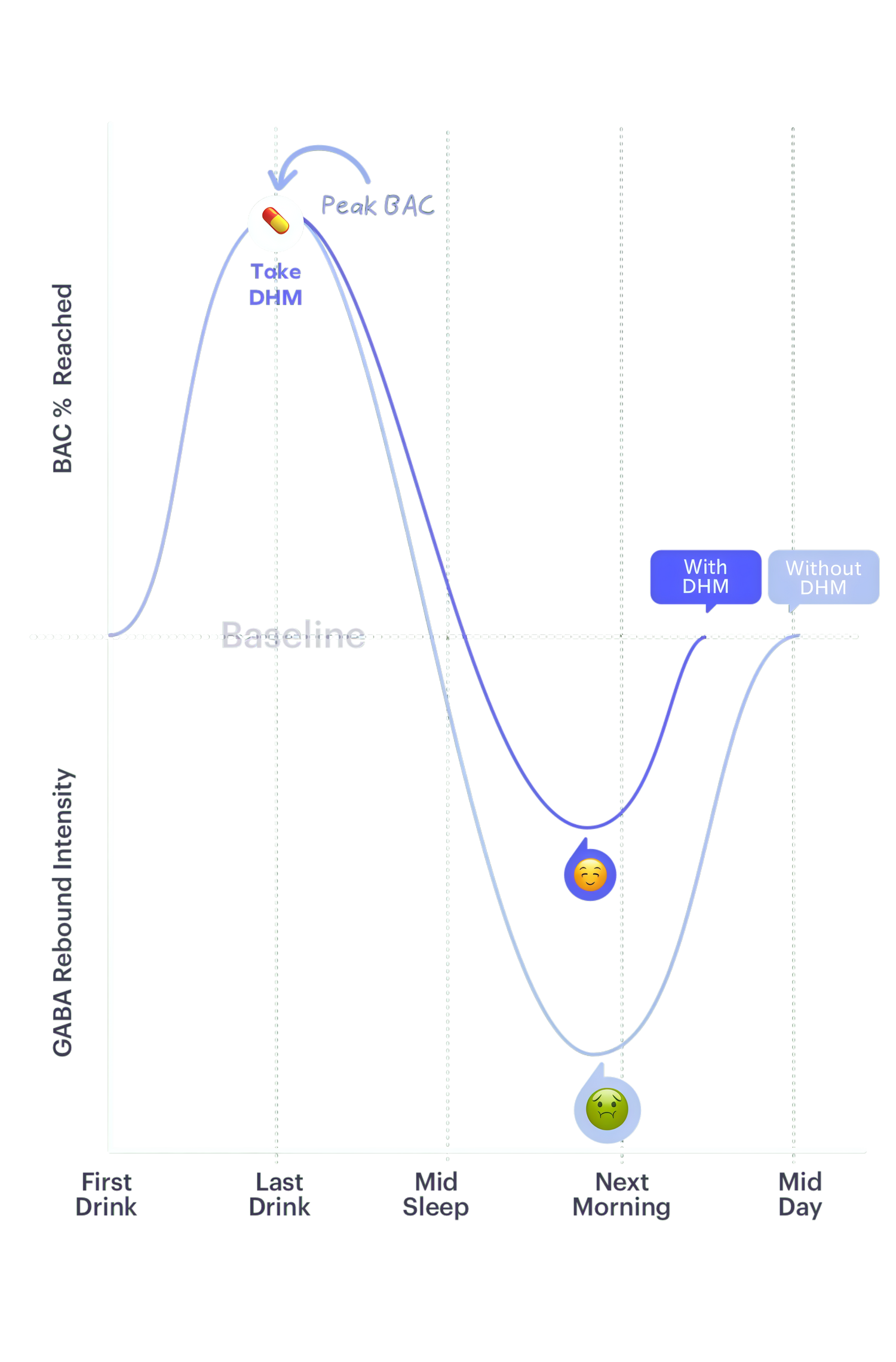 The dihydromyricetin (DHM) in Cheers reduces GABA rebound by roughly half.When taken at peak blood alcohol concentration (BAC), the DHM in Cheers binds to those same GABA receptors, working while you sleep to buffer those rebound effects so you can sleep better & wake up feeling better.