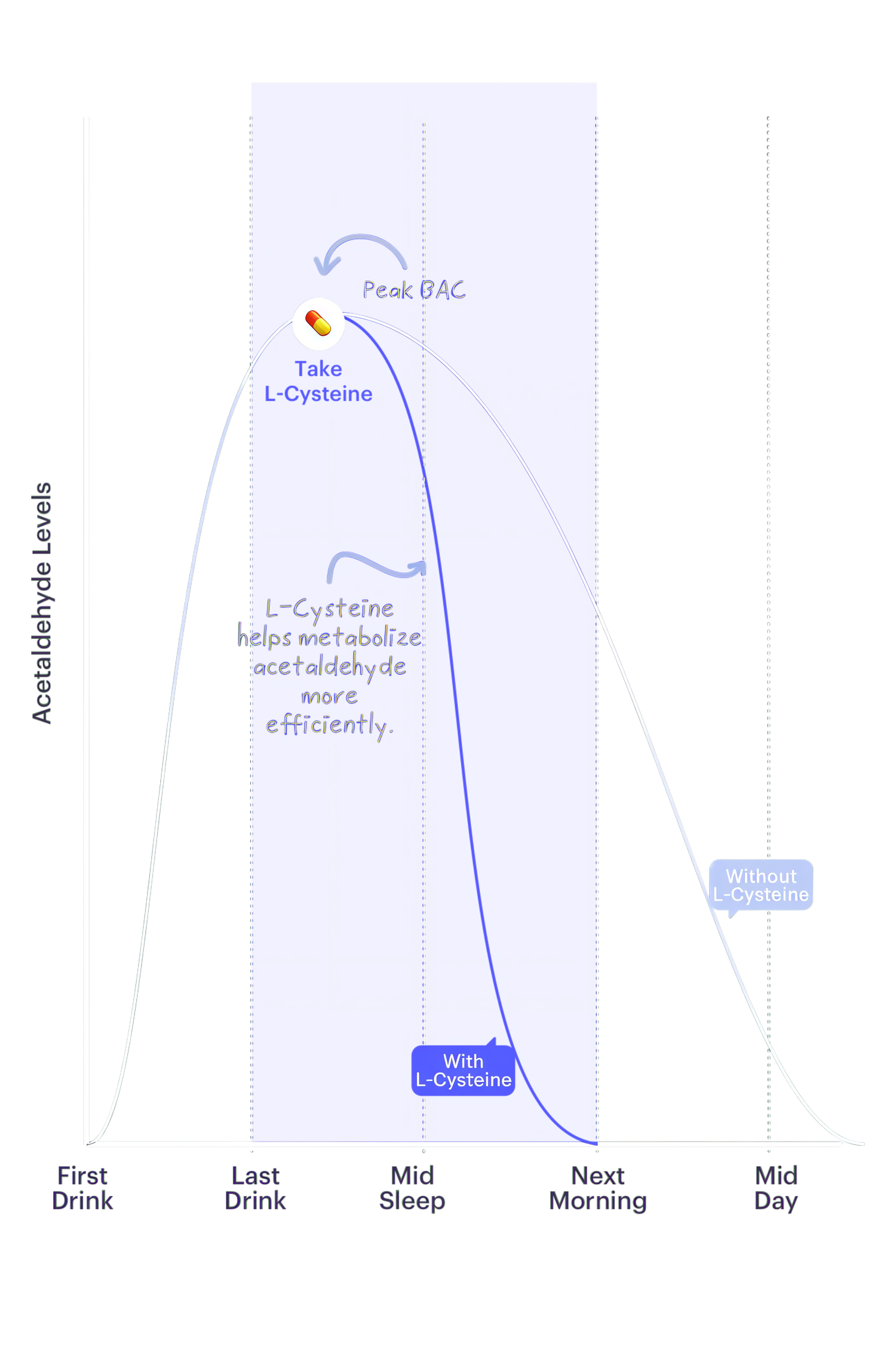 Cysteine will bind to acetaldehyde and form a non-toxic compound called MTCA, effectively neutralizing acetaldehyde. You’ll be able to metabolize alcohol far more efficiently, reducing these next-day effects.